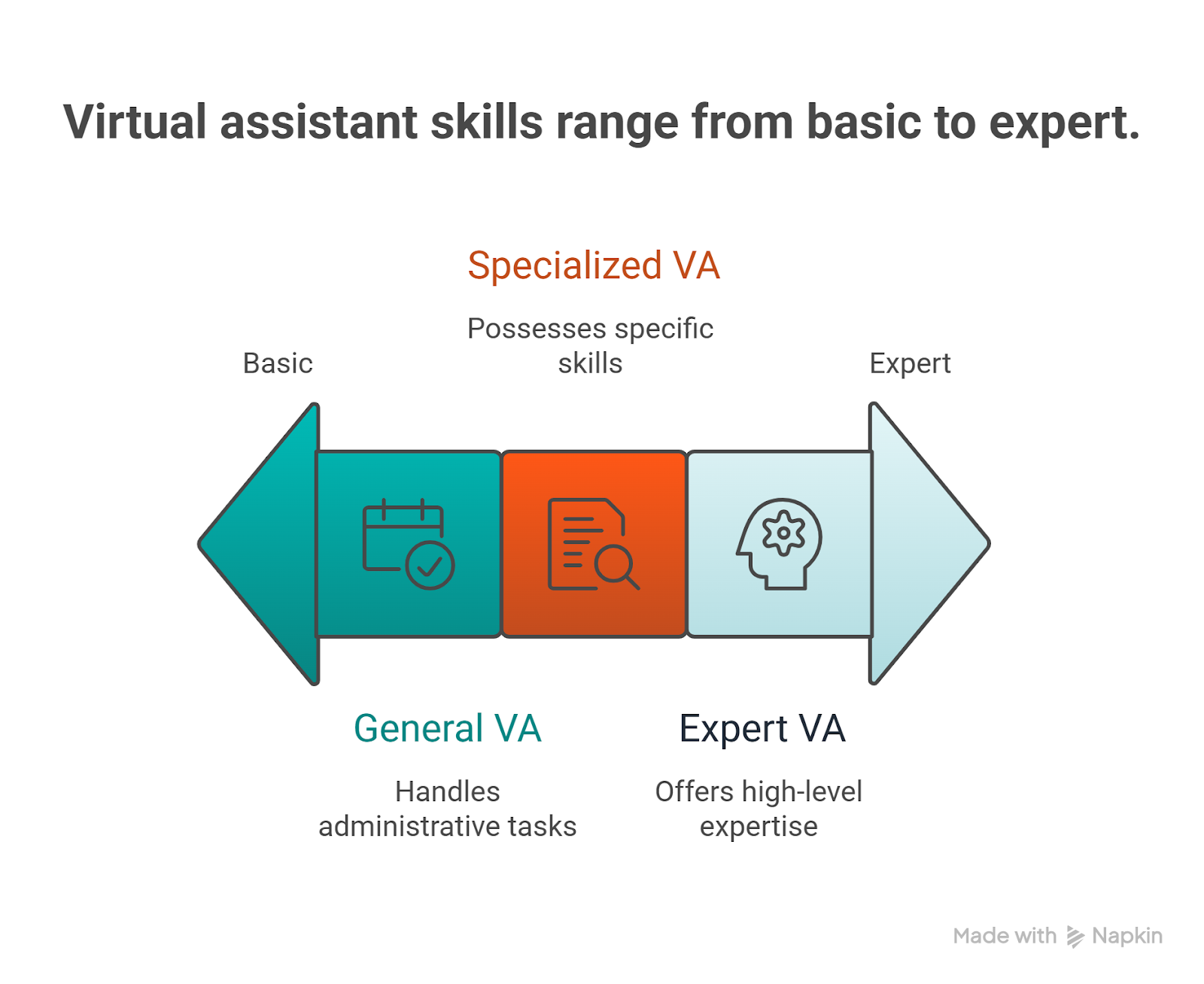 Step 2: Categorize tasks by skill level required. Virtual assistants generally fall into three categories: