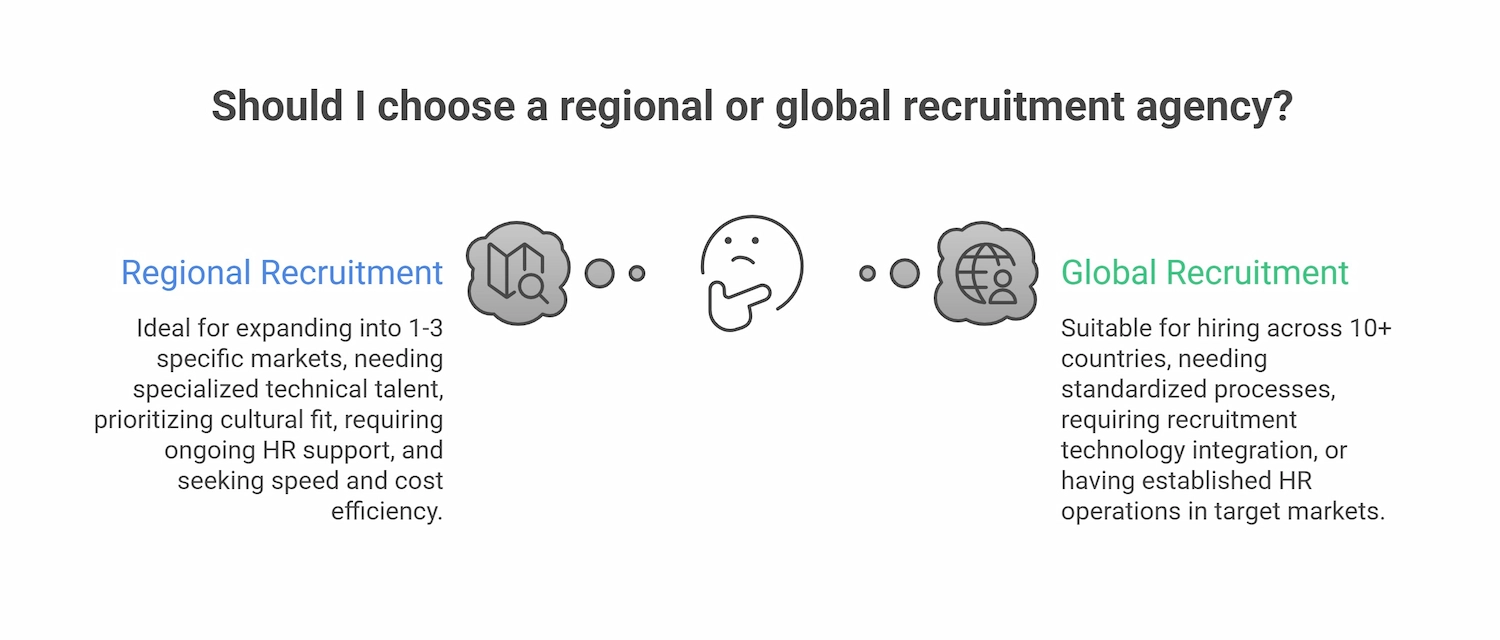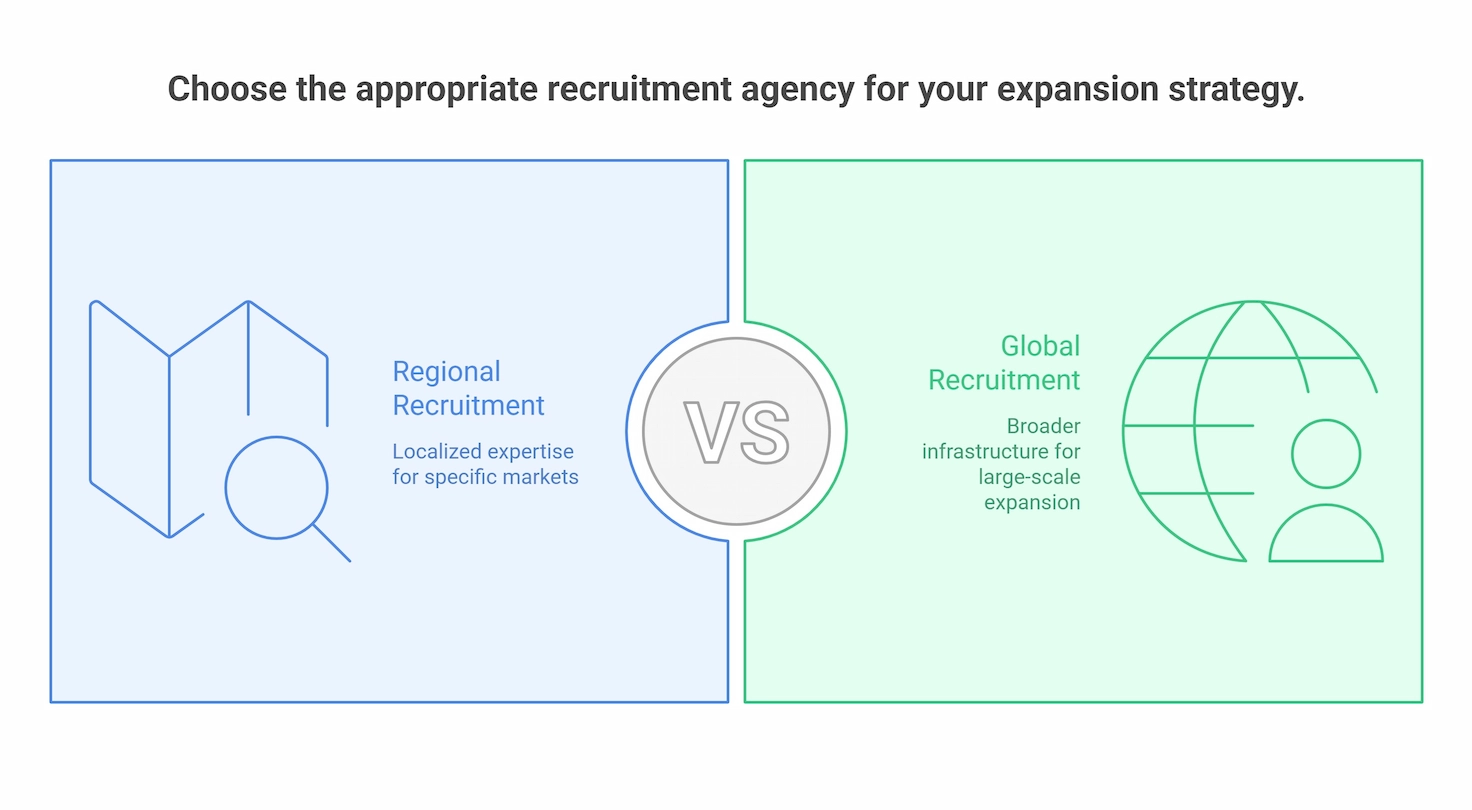 The choice between regional and global recruitment depends largely on expansion strategy: companies entering a small number of new markets often benefit from localized expertise, while organizations expanding simultaneously across many countries may require the broader infrastructure and reach of a global provider.